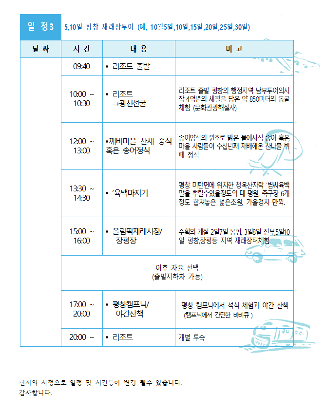 NOTICE평창 전통 시장 버스 투어 점심, 저녁 식사, 숙박과 관광지 3곳 무료 투어